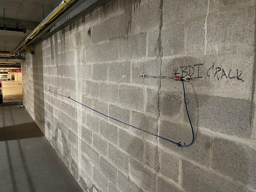 - Crackmeter displacement sensors installed at the foundation level to monitor activation or progression of existing cracks