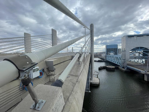 Displacement sensors were also placed at select bearing locations to verify that the bridge was expanding and contracting as designed. Environmental sensors (including temperature, humidity, and wind sensors) were integrated into the system to correlate structural responses with changing weather conditions.